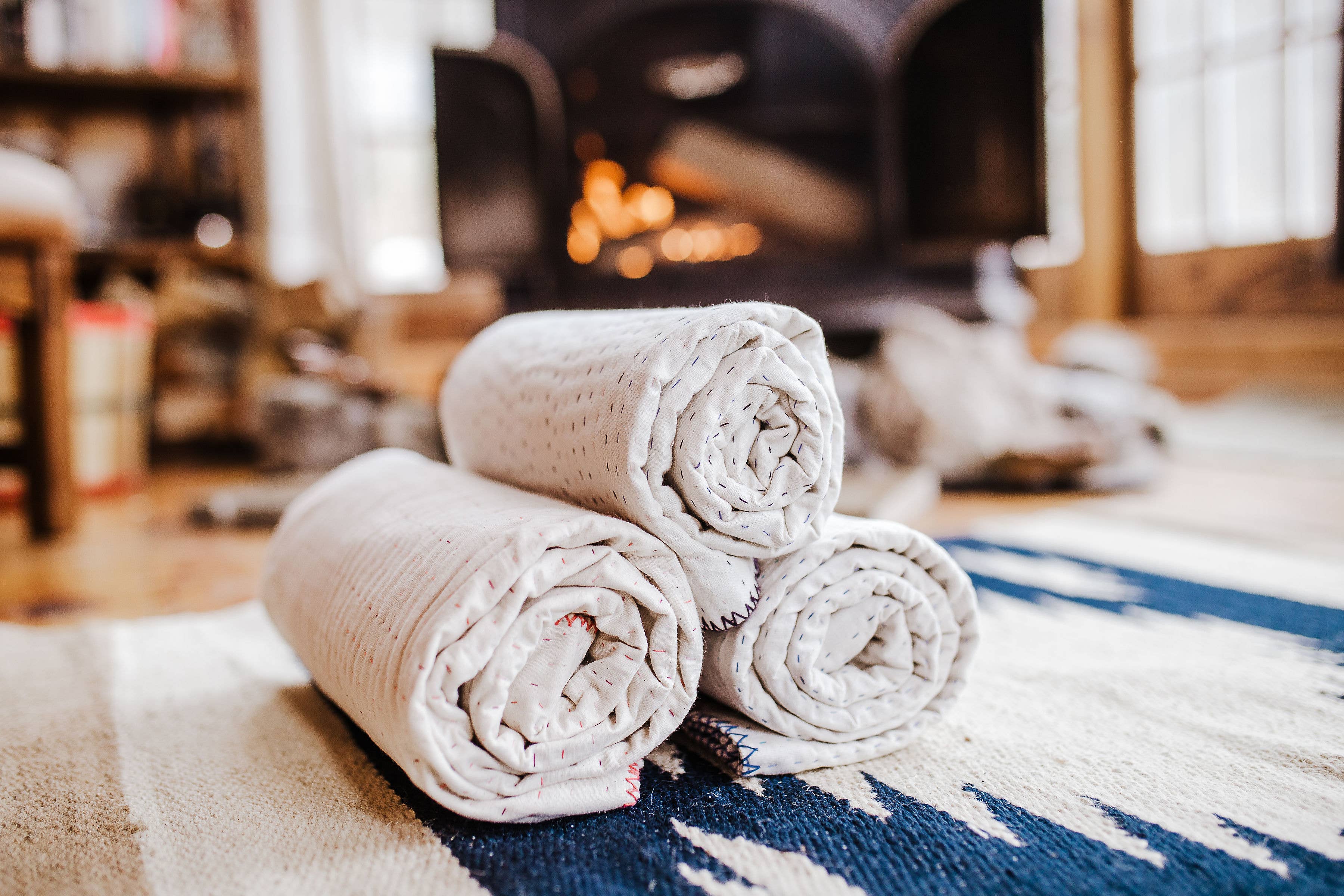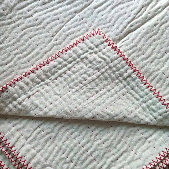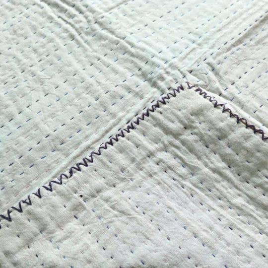 Discover the Basha Kantha Unbleached Cotton Blanket – a perfect blend of minimalist design and timeless craftsmanship. Crafted from unbleached cotton, this blanket showcases sharp, bold stitching and is meticulously edged by hand with a zig zag stitch.