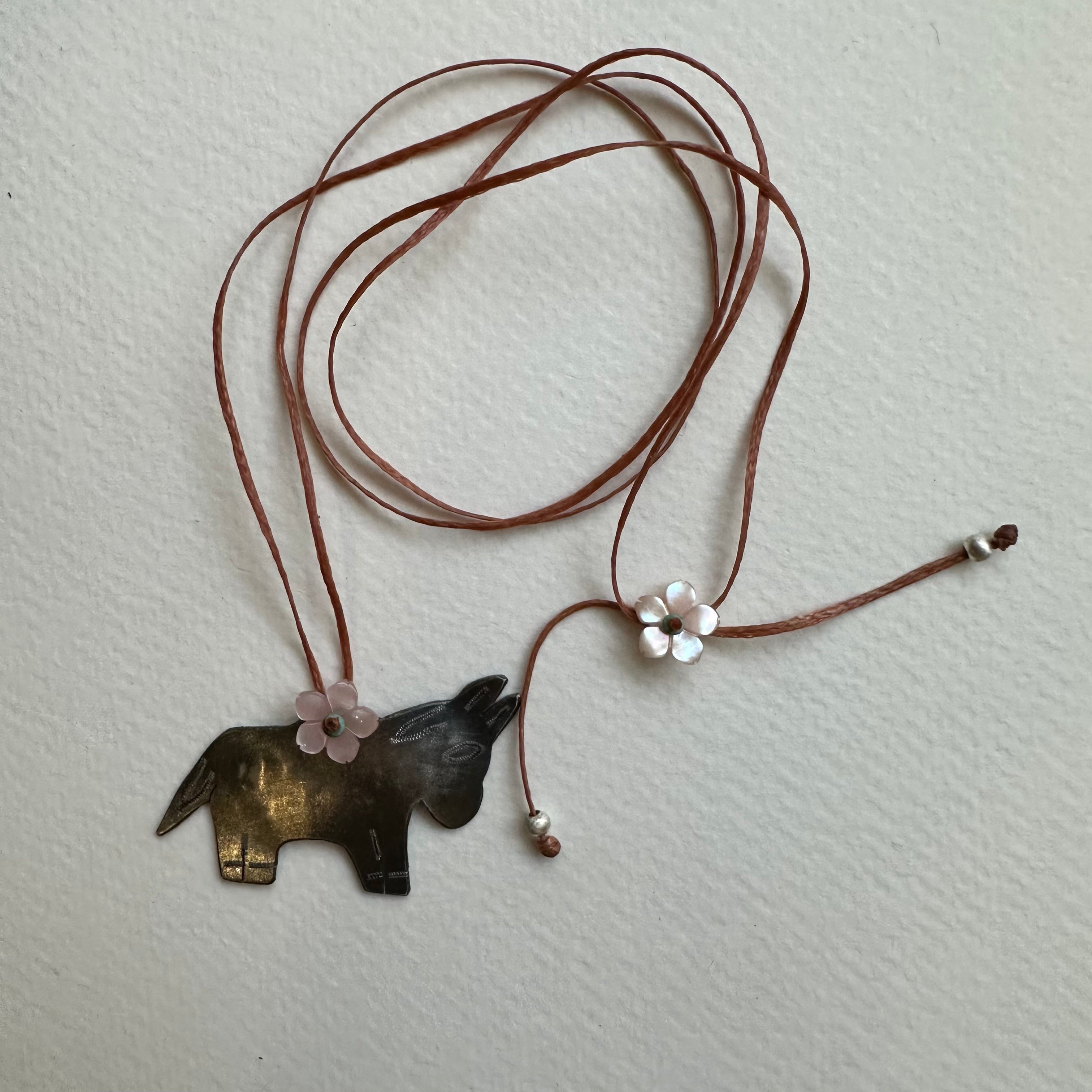 Handmade sterling silver burro milagro. Milagro means miracle in Spanish. Natural pink mother of pearl flower and turquoise detail on soft brown nylon. 26" adjustable